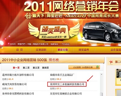 我公司被評為阿里巴巴2011網(wǎng)絡(luò)營銷500強(qiáng)第22名